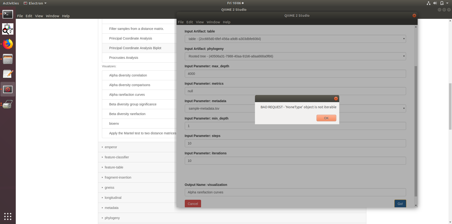 .Please find all the output below I got after running the command. Also, after updating the package I ran the Alfa rarefying curve in studio again and got similar error. I am attaching the screenshot of studio for your view. Thank you.