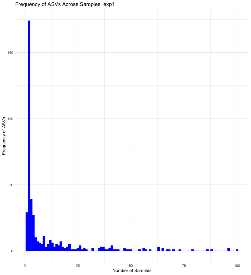 My dataset is derived from 16S rRNA sequencing of in vivo-cultured biofilms, with approximately 20 replicate samples for each biofilm group. Interestingly, these replicates show significant variation in ASVs. In total, my dataset comprises 607 ASVs across 207 samples, post data-trimming based on read count and ASV abundance. (To be retained in the dataset, ASVs must be present in two or more samples at a relative abundance of 0.01%. When I increase the trimming threshold to five samples and 0.1%, I lose 60% of the ASVs.)