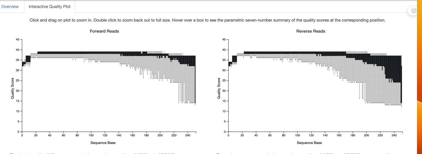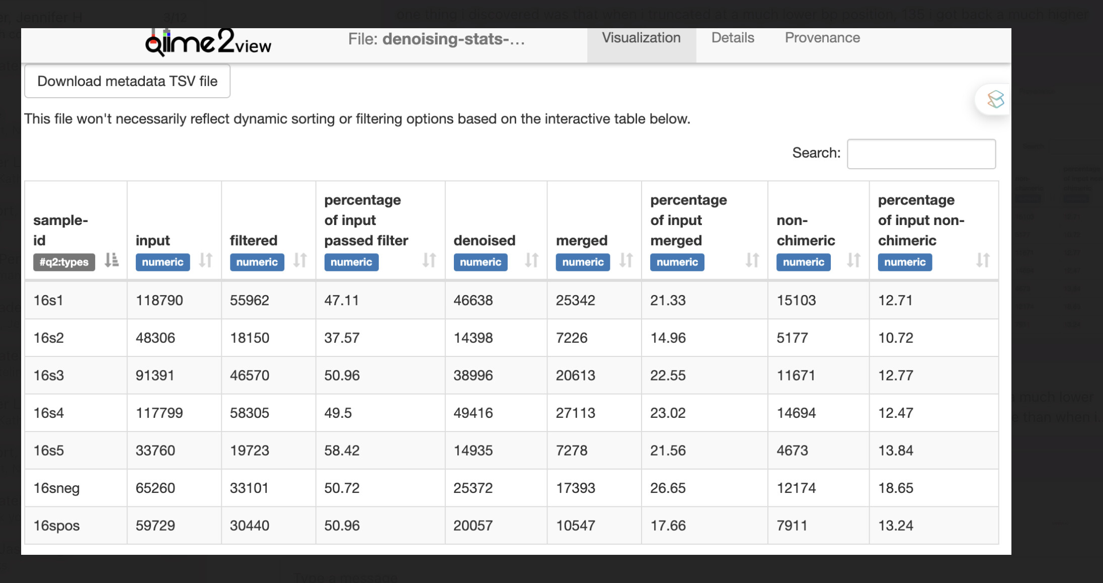 Hi everyone, I am new to using Qiime so i am having some hard time on perfectly picking my trunc,trim parameters from my dada2 denoising. I am curently working on 16s and i have 250bp each on forward and reverse reads, when i truncated at 245, the reads i got through the filte was very low and even when i passed 0 to the trunc so i use all my reads, i got same thing. However, when i used truncated using the 25th percentile i. 135, i got at least 40-50% of my reads passed the filter. I would appreciate knowing how this works and what the most important thing about the paramteer picks are.I attach some images below