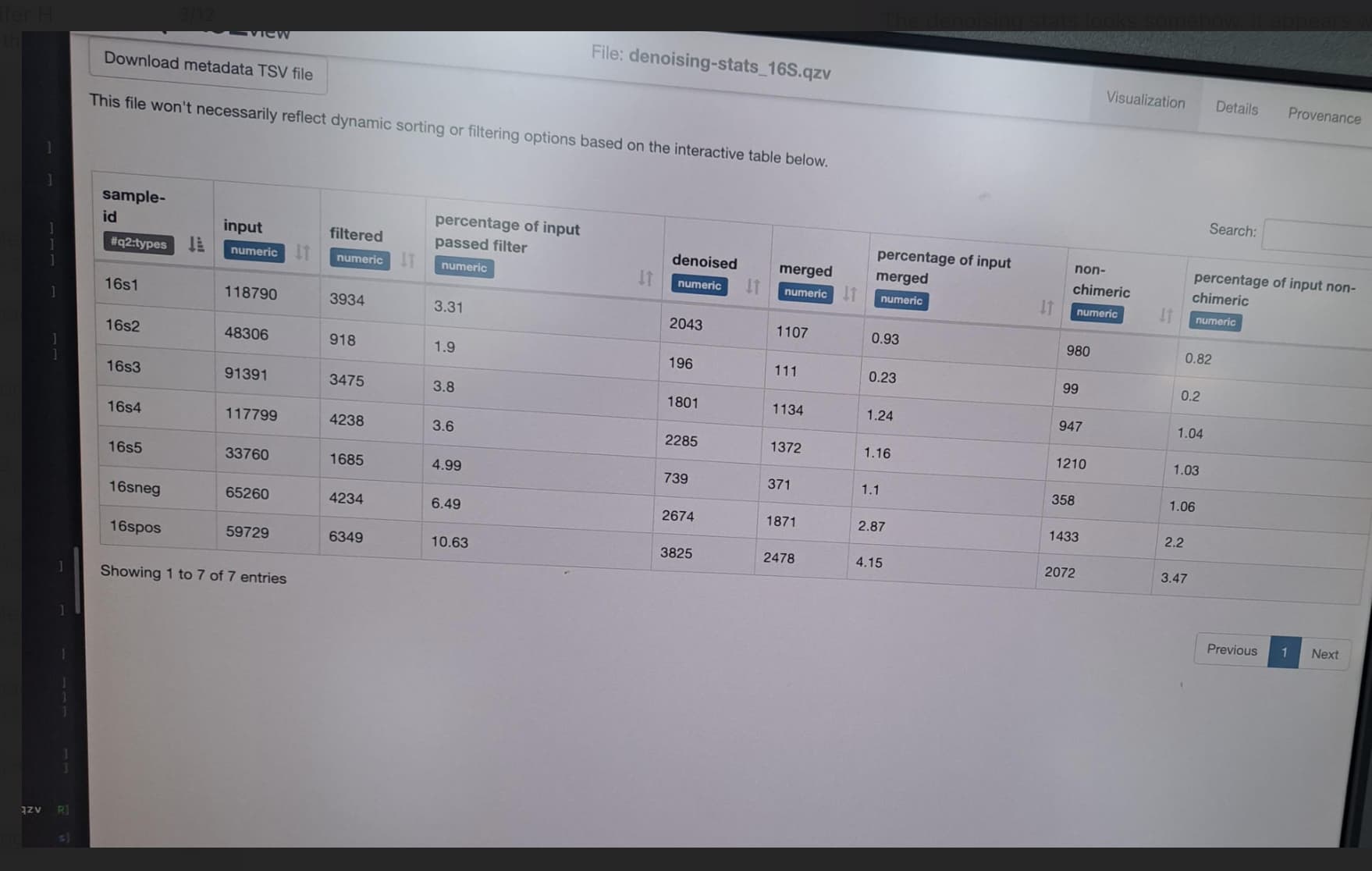 - The first dada2 stats file show few reads passing filter and few reads merging, which is bad...