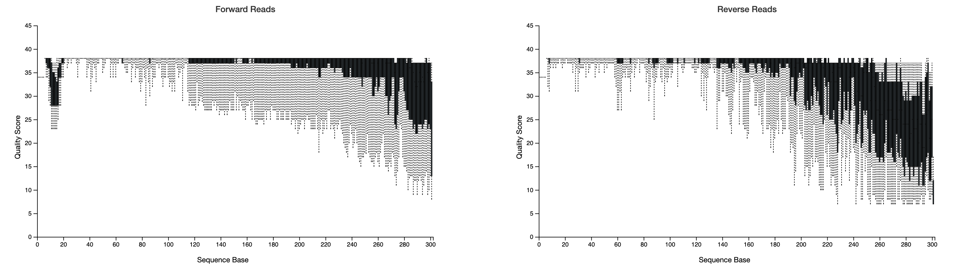 I'm running qiime2 2020.11 in conda and processing some mouse microbiota samples. I've made it from importing my pair ends, processing them in dada2, assigning taxonomy and even producing bar plots (yay!). However, I've struggled identifying the correct trim/trunc combination to use for these data.