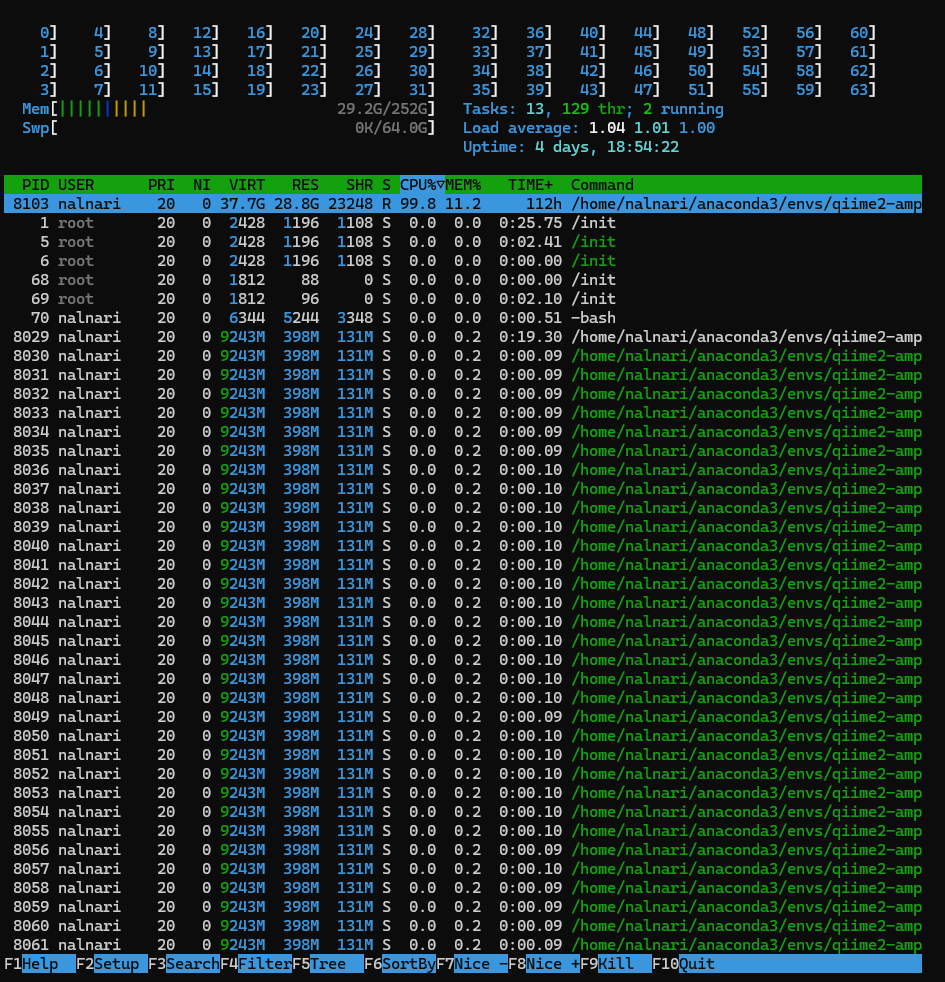The top shows a bunch of other Qiime processes that are 'sleeping'.