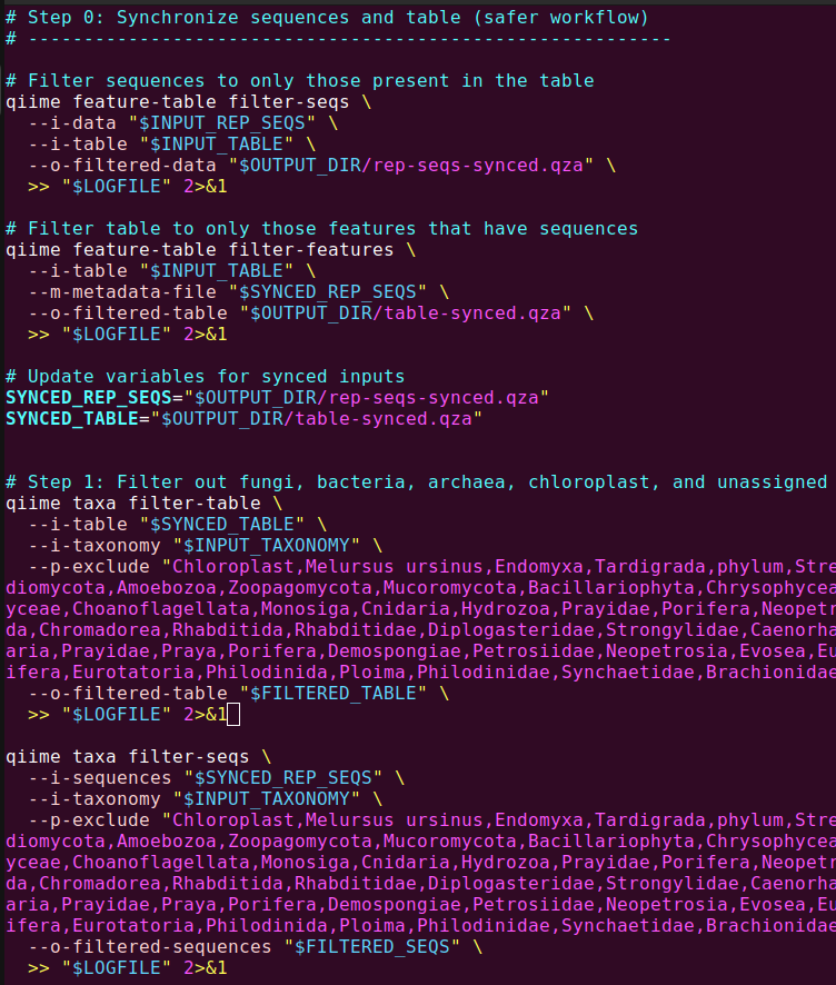 --p-exclude "Fungi,fungi,Bacteria,bacteria,Archaea,archaea,chloroplast,Chloroplast,Carnivora,Streptophyta,Chlorophyta,Mucoromycota,Ailurus,Aves,Bacillariophyta,Unassigned" \