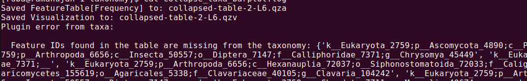 I am analyzing a COI amplicon dataset and running into a taxonomy mismatch issue after filtering out unwanted lineages. The error appears specifically when I try to collapse my feature table at the genus level.