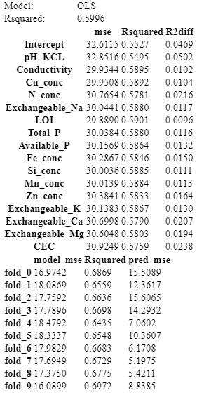 b) In one of the trial runs using gneiss, all the soil parameters (both chemical and physical analyses) were used to compute linear regression summary (through ols-regression after correlation-clustering), Rsquared of more than 0.600 was achieved. Unfortunately, all the pred_mse values (from fold 0 to 9) were higher than model_mse. I then tried to run again with only soil chemical parameters (16 covariates and 50 observations). pred-mse values (ranging from 7.5 to 22) ranging from are now lower than model-mse (ranging from 22 to 26). I am still thinking whether to further reduce the number of soil chemical parameters (or covariates) and re-run with ols-regression. Would like to know is there any minimum ratio (pred-mse to model_mse) required or we should achieved prior to balance-taxonomy analyses? Any maximum number of covariates allowable for ols-regression?