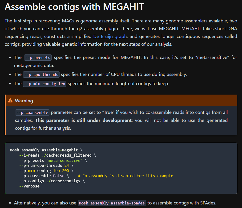 In the “Assemble contigs with MEGAHIT” section of the 2025.4.0 documentation (Recovery of MAGs — MOSHPIT tutorials), it is mentioned that the –p-coassemble parameter is “…still under development: you will not be able to use the generated contigs for further analysis.”