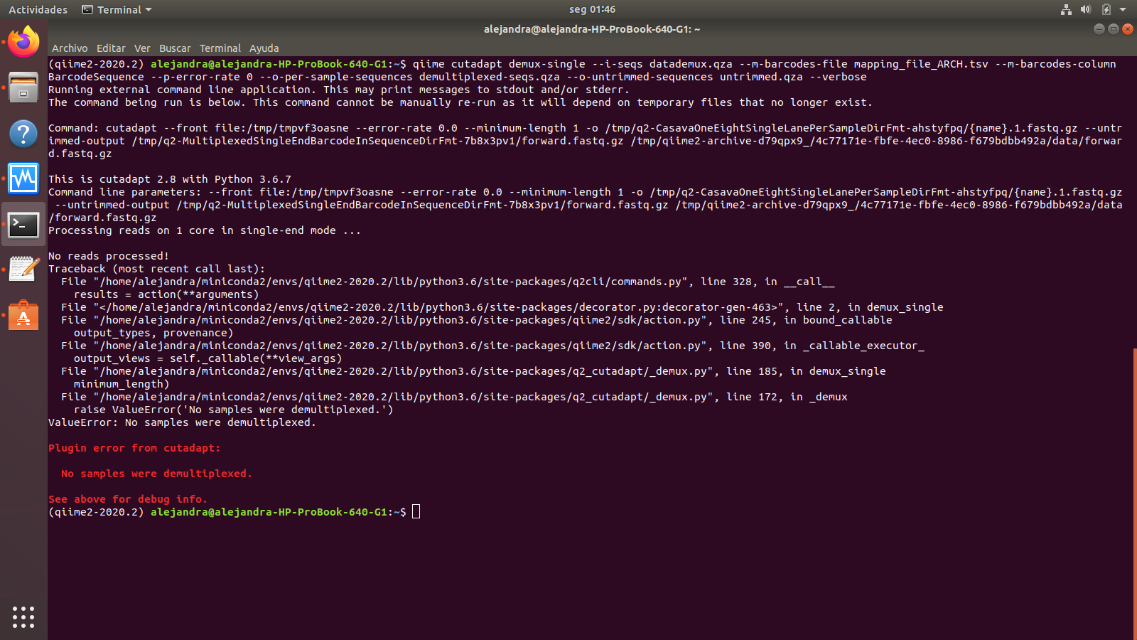 qiime cutadapt demux-single --i-seqs datademux.qza --m-barcodes-file mapping_file_ARCH.tsv --m-barcodes-column BarcodeSequence --p-error-rate 0 --o-per-sample-sequences demultiplexed-seqs.qza --o-untrimmed-sequences untrimmed.qza --verbose