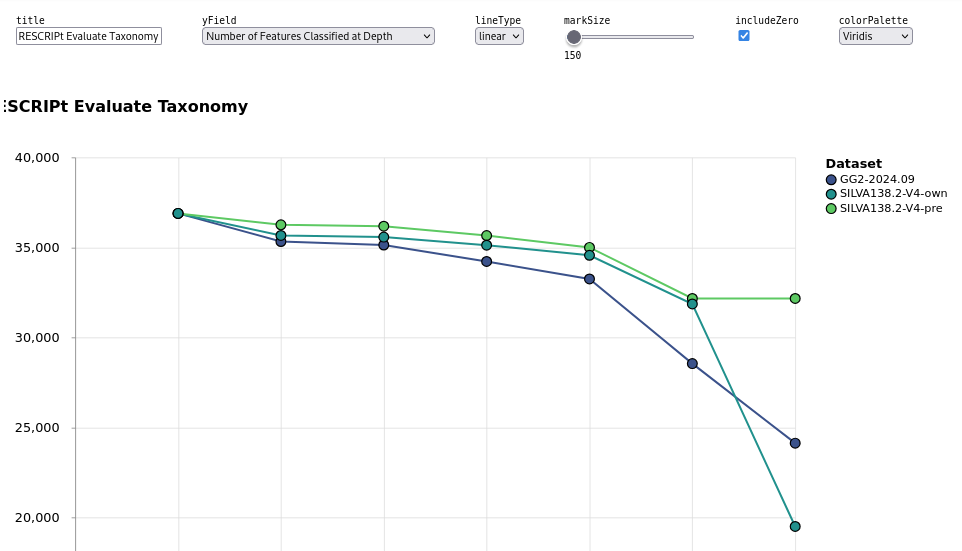 With the uniform silva 138.2-V4 classifier (SILVA138.2-V4-pre) , I observe the same number of features classified at depth 6 (genus) and 7 (species), see the horizontal line. However, the SILVA team did not include species labels at the q2 rescript parse-silva-taxonomy step (as recommended), but the (default) rank handles were used down to species level in the downstream q2 rescript dereplicate step.