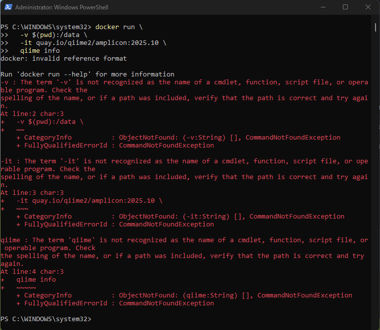 I have installed Docker and downloaded two distributions (Amplicon & Pathogenome). Both show up under Containers as expected. However, when I attempt to start either, they both immediately exit. I have attempted to run the “Test your install” command for both in PowerShell but receive the following errors: