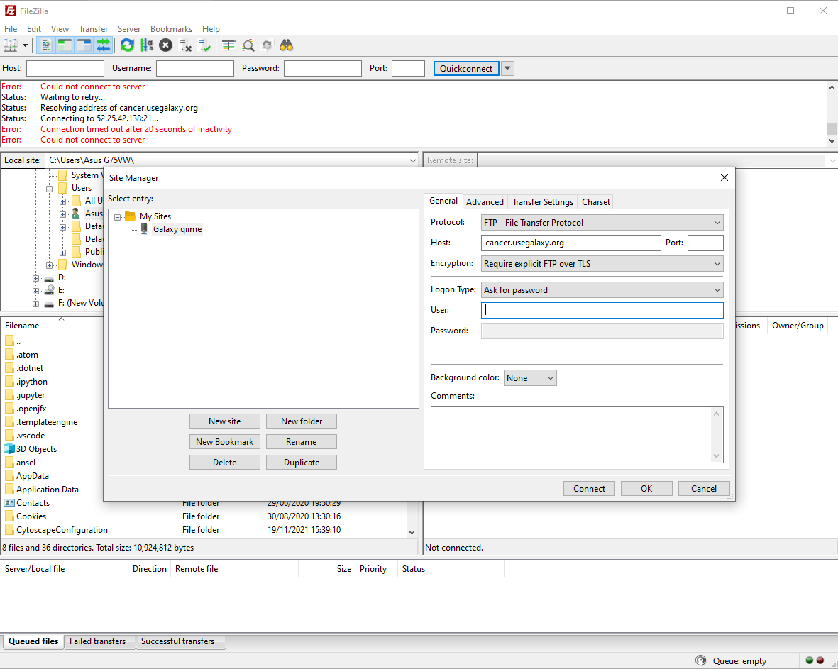 Hi everyone, i want to learn how to use the QIIME2 galaxy server. I would like to use my own nano data so I know exactly what to do when I get my more data in the future. I am trying to connect to the server with FileZilla and it keeps coming up with an error and a connection timeout. It doesn't even ask for a password despite me asking for that. I have followed the ftp tutorial Galaxy FTP Upload - Galaxy Community Hub .