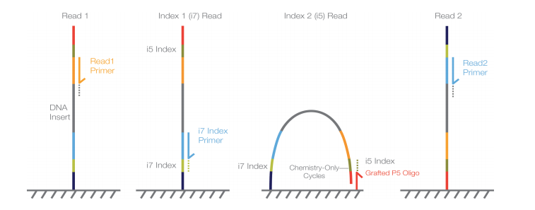 Currently I am analyzing a Miseq mock library. My understanding of Miseq read structure is that the PCR primers used to generate the amplicons are directly adjacent to the insert (grey), and the Illumina indices, sequencing primers, etc are distal to the insert, as shown in this image: