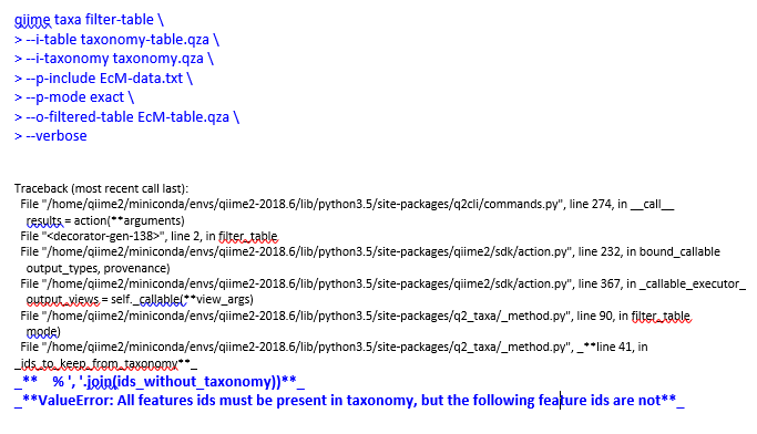 File "/home/qiime2/miniconda/envs/qiime2-2018.6/lib/python3.5/site-packages/q2_taxa/_method.py", line 35, in _ids_to_keep_from_taxonomy