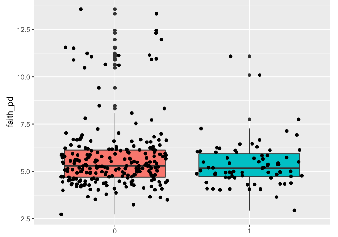 I am comparing Faith's phylogenetic diversity across two groups of stool samples from 2-year-old children. Within each group's distribution of Faith PD values, I notice that there appear to be two clusters (see screenshot of boxplot attached). I've investigated to participants in each cluster but haven't found that they differ based on any other variable measured in the study. I'm pretty new to microbiome analyses, and I am not sure how to further evaluate the reason for the clusters or how to address them when reporting results. Does anyone have suggestions for how to investigate or what to say about the clusters? Relatedly, does anyone have a sense of what a reasonable range for Faith PD values would be among stool samples from 2-year-old human children?