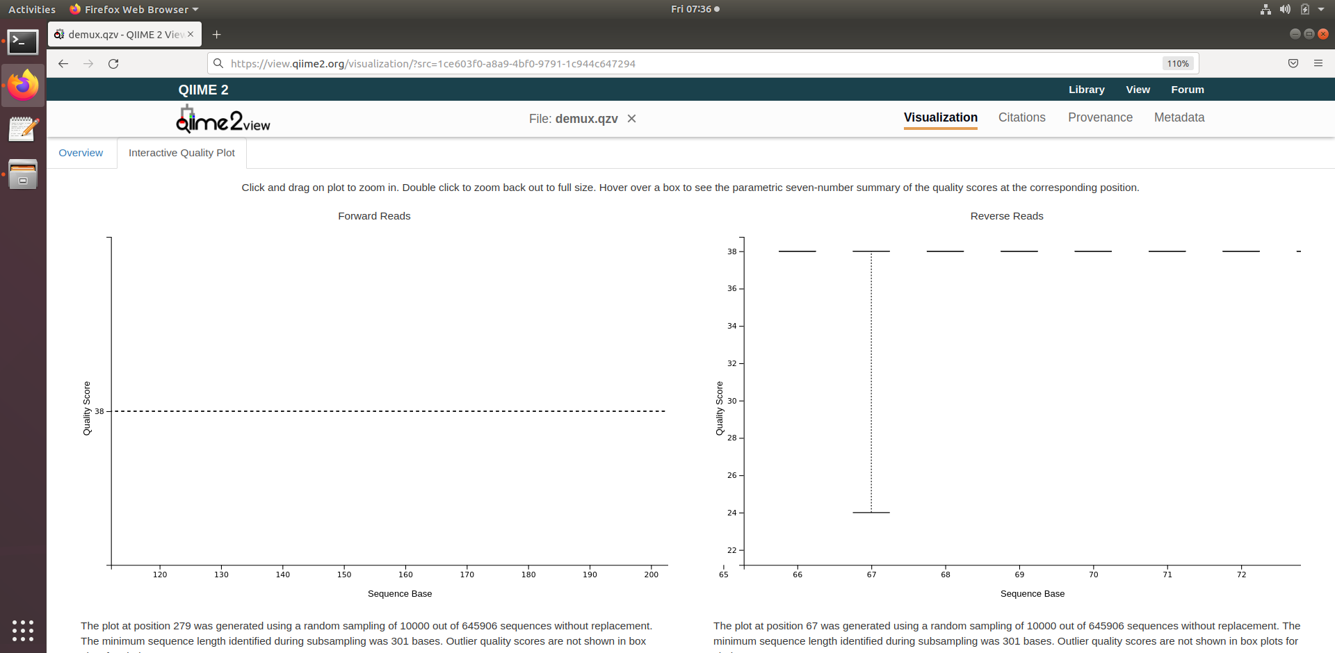 i had run my sequences and i am getting demultiplxed curve data visualized from qiime view that gives me all single line rather than box plot at 1-301 position bases is it even correct or technical error i am pasting the code for references. qiime tools import \